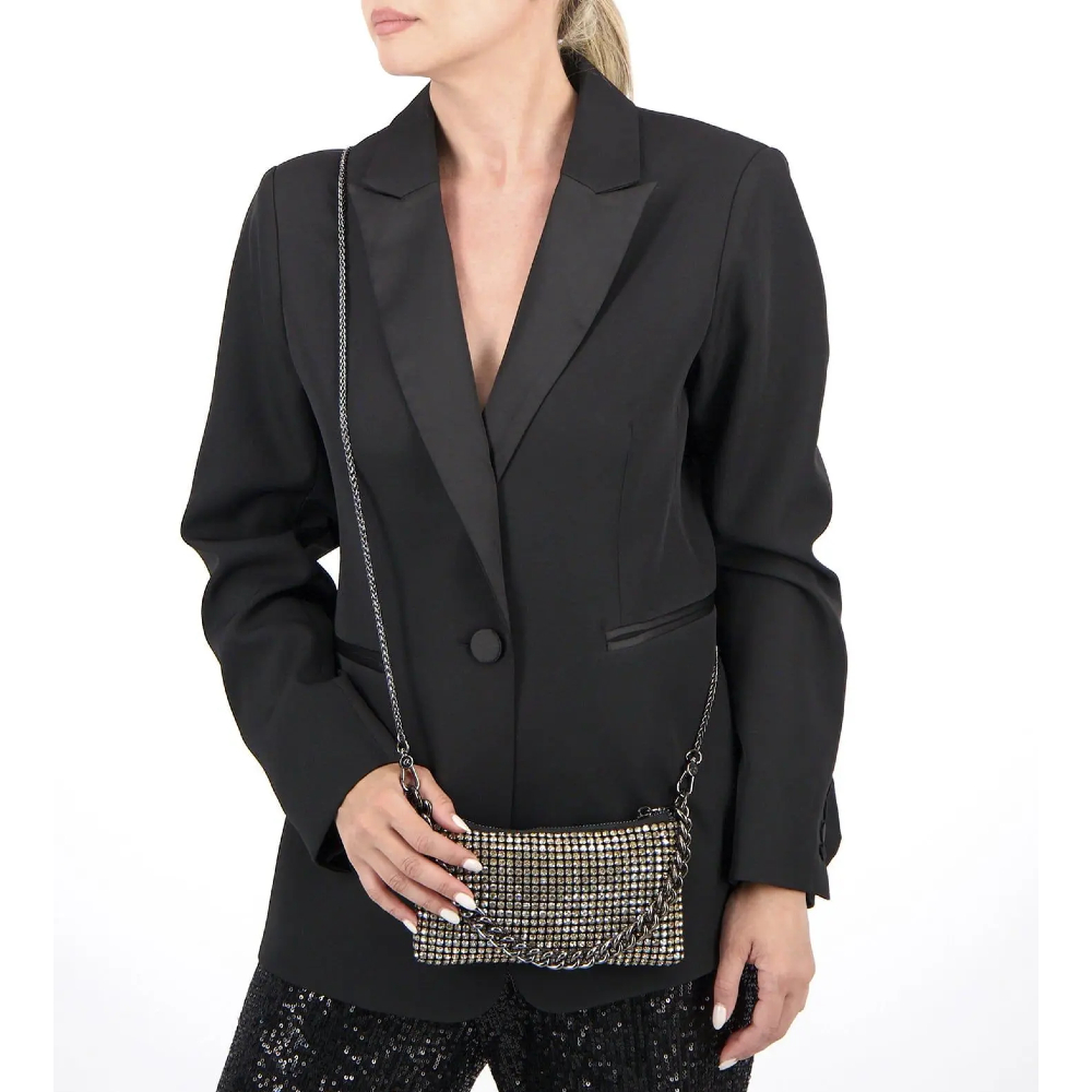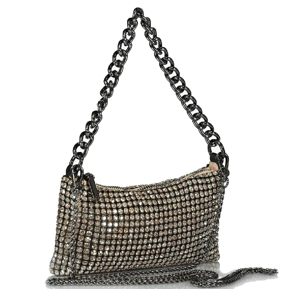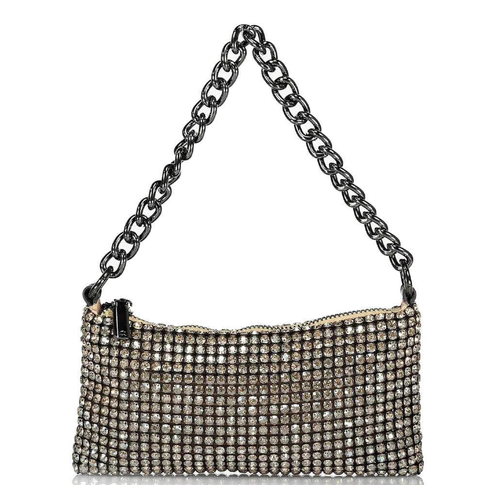 Γυναικεία αμπιγιέ τσάντα χειρός με στρας και χοντρή αλυσίδα. Διαθέτει επιπλέον αποσπώμενη αλυσίδα για να φορεθεί και χιαστί. Κλείνει με φερμουάρ. Εσωτερικά είναι επενδυμένη με φόδρα και υπάρχει τσέπη με φερμουάρ. Ιδανική για βραδινές και επίσημες περιστάσεις.