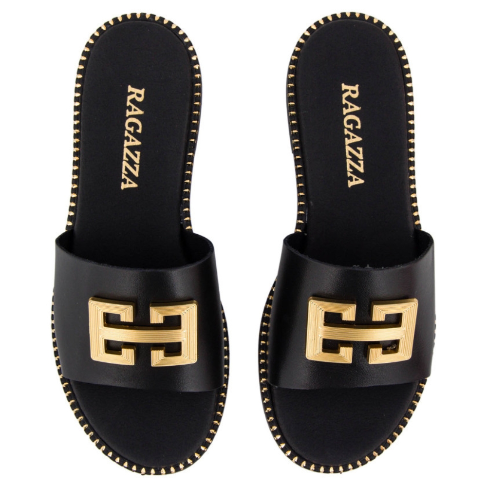 Γυναικεία φλατ σανδάλια Ragazza με διακοσμημένη φάσα και περιμετρικές εξωτερικές λεπτομέρειες στον πάτο. Xαρίζει ανάλαφρο πάτημα και έχει άνετη φόρμα.