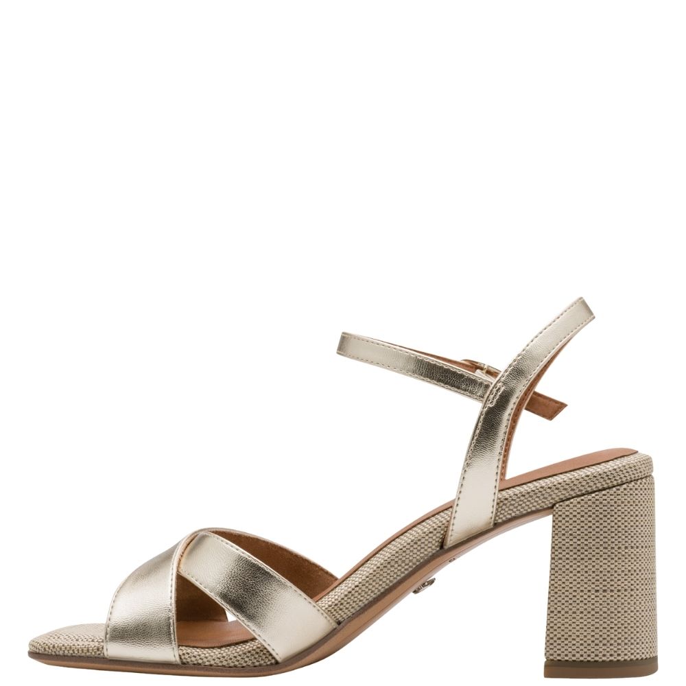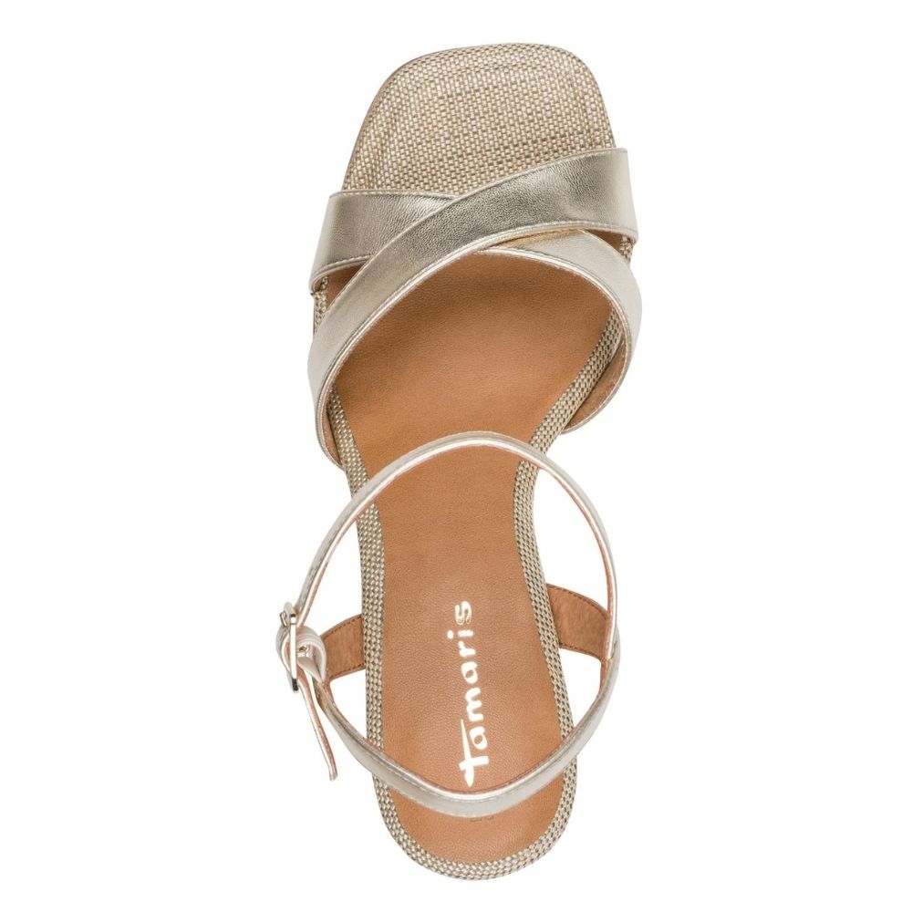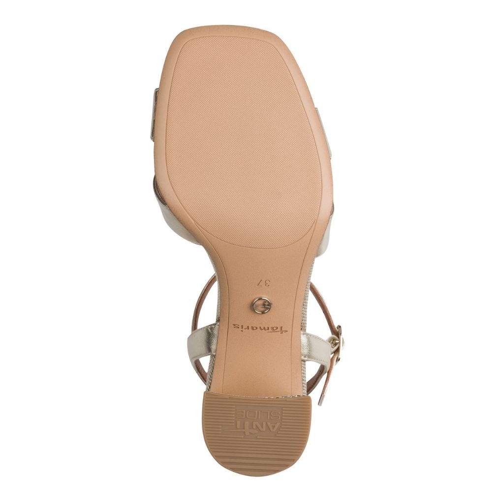 Κομψά γυναικεία πέδιλα Tamaris σε ανοιχτό χρυσό χρώμα, με διακριτική λάμψη και σταθερό τακούνι. Ιδανικά για καθημερινές αλλά και πιο προσεγμένες εμφανίσεις.
